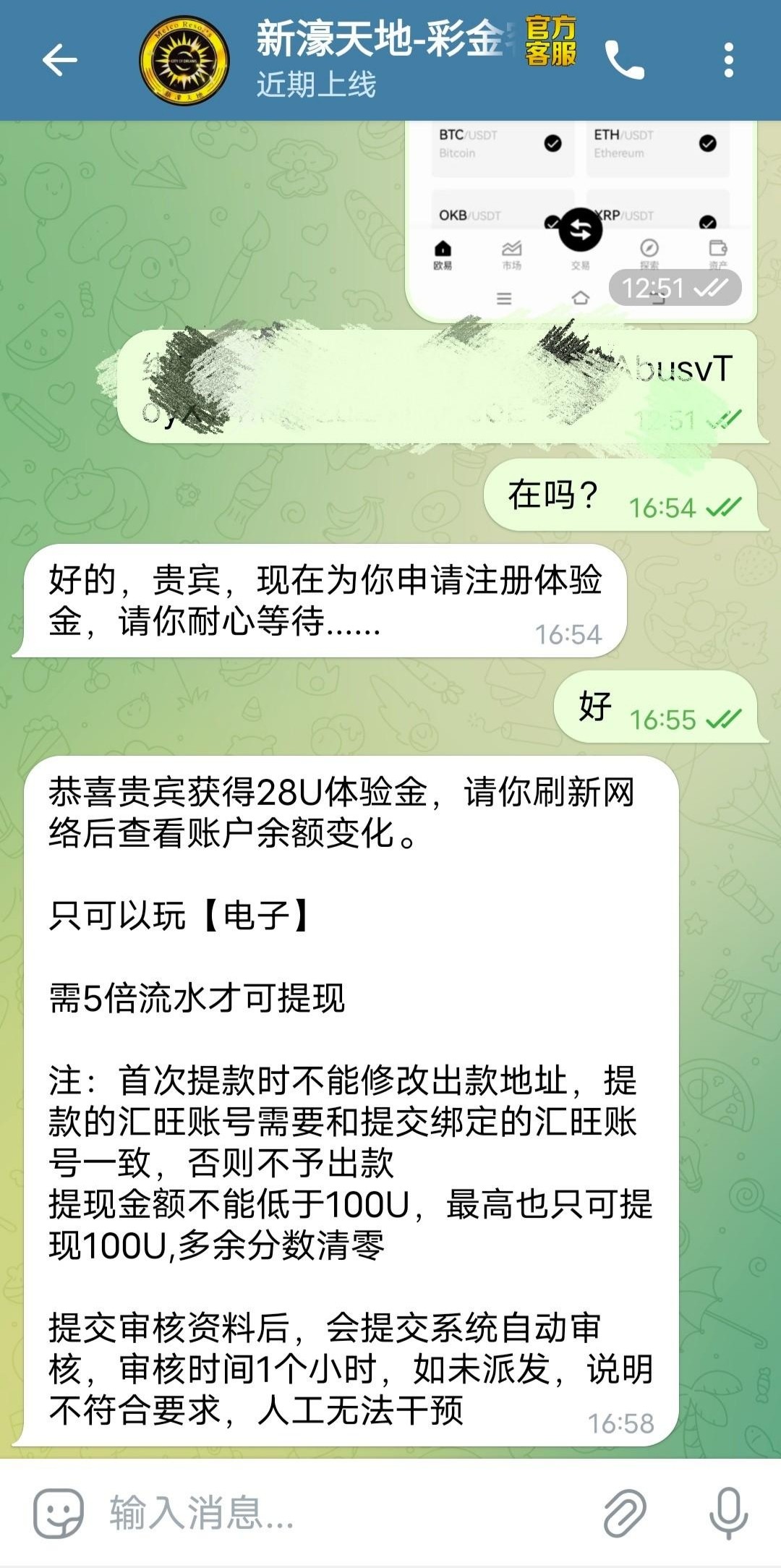 需录制汇旺/usdt交易流水,限制电子,5倍流水,最低最高100u提现,其他自测。