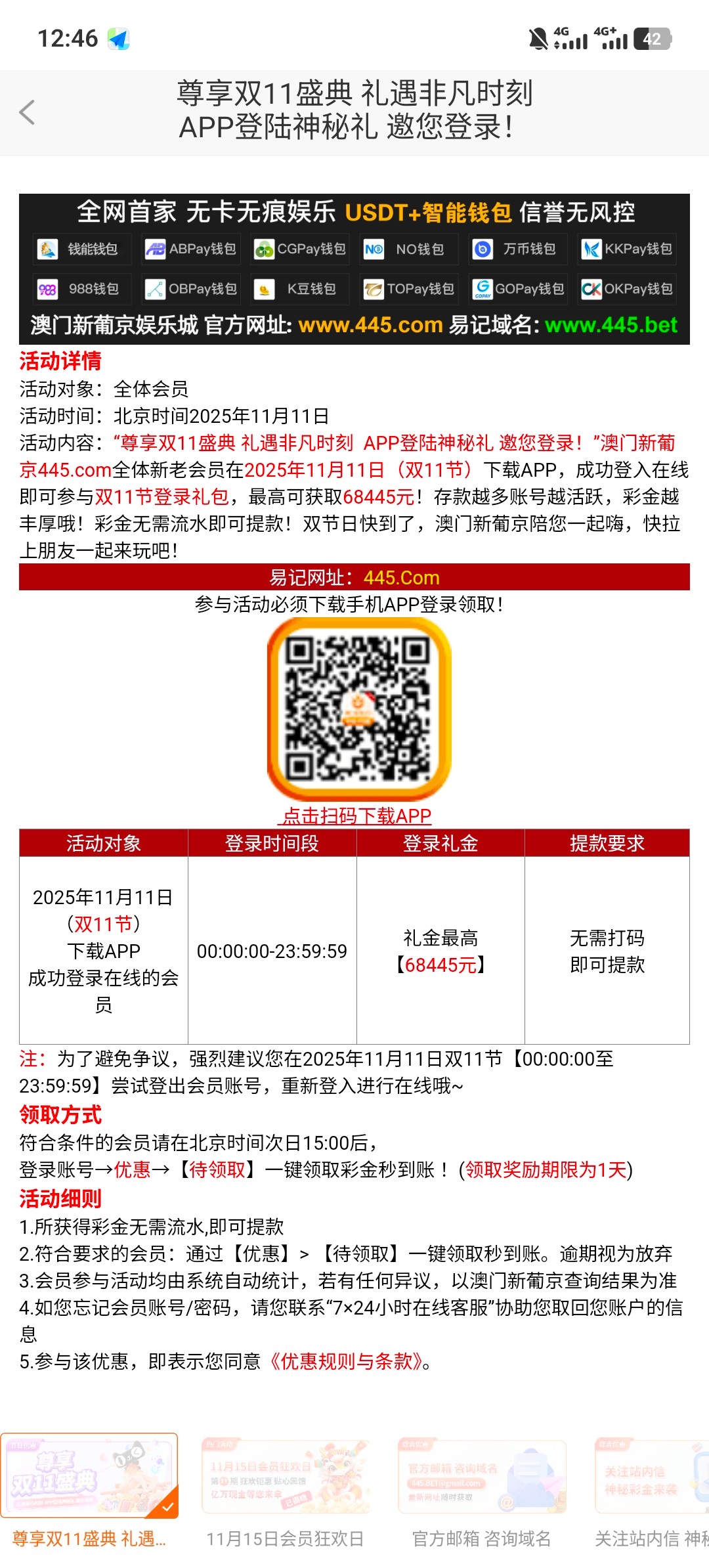 445.com 11月12日自动派送 登录就有 有号上去看