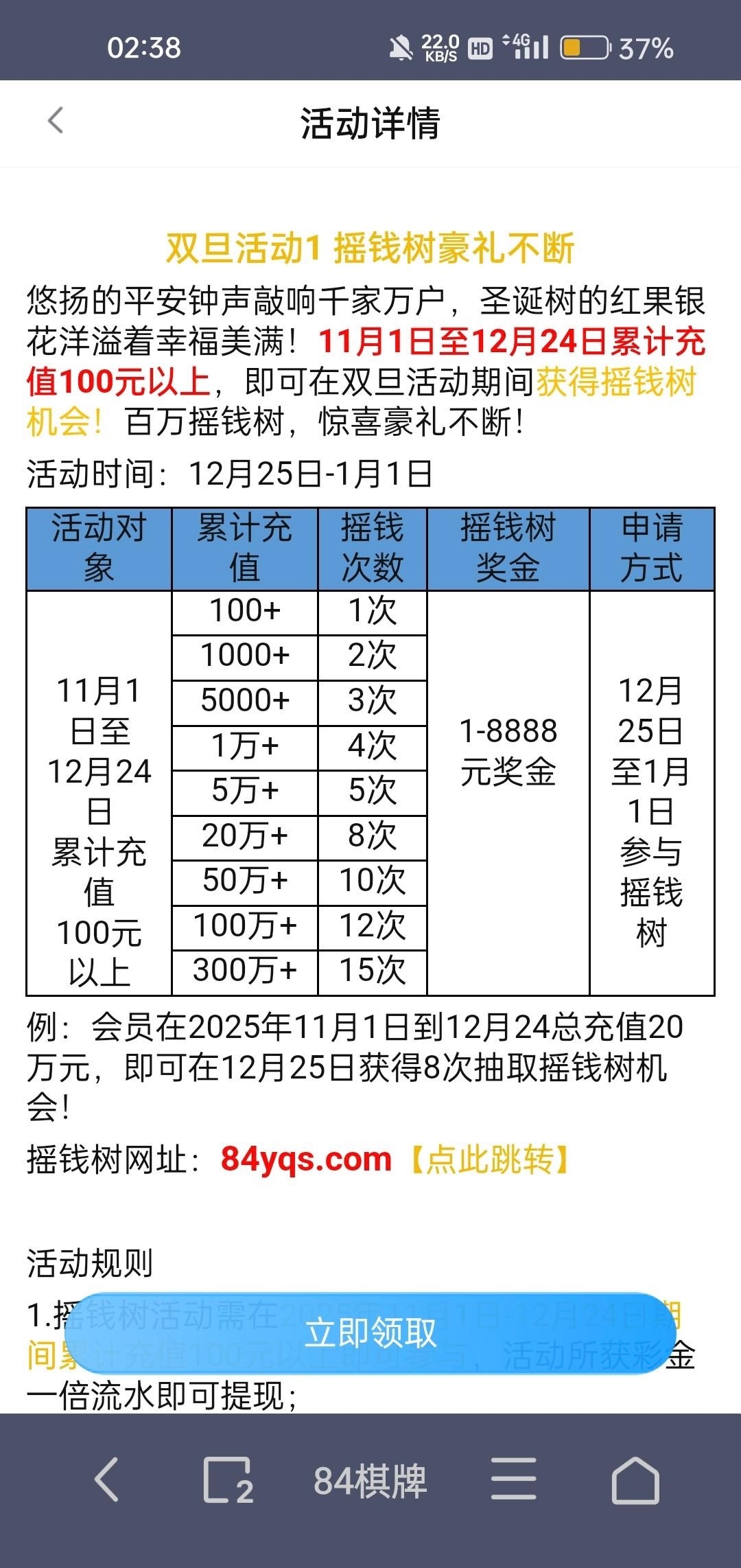 11月1号到12月24号累计充值100就可以参加 链接 84.bet