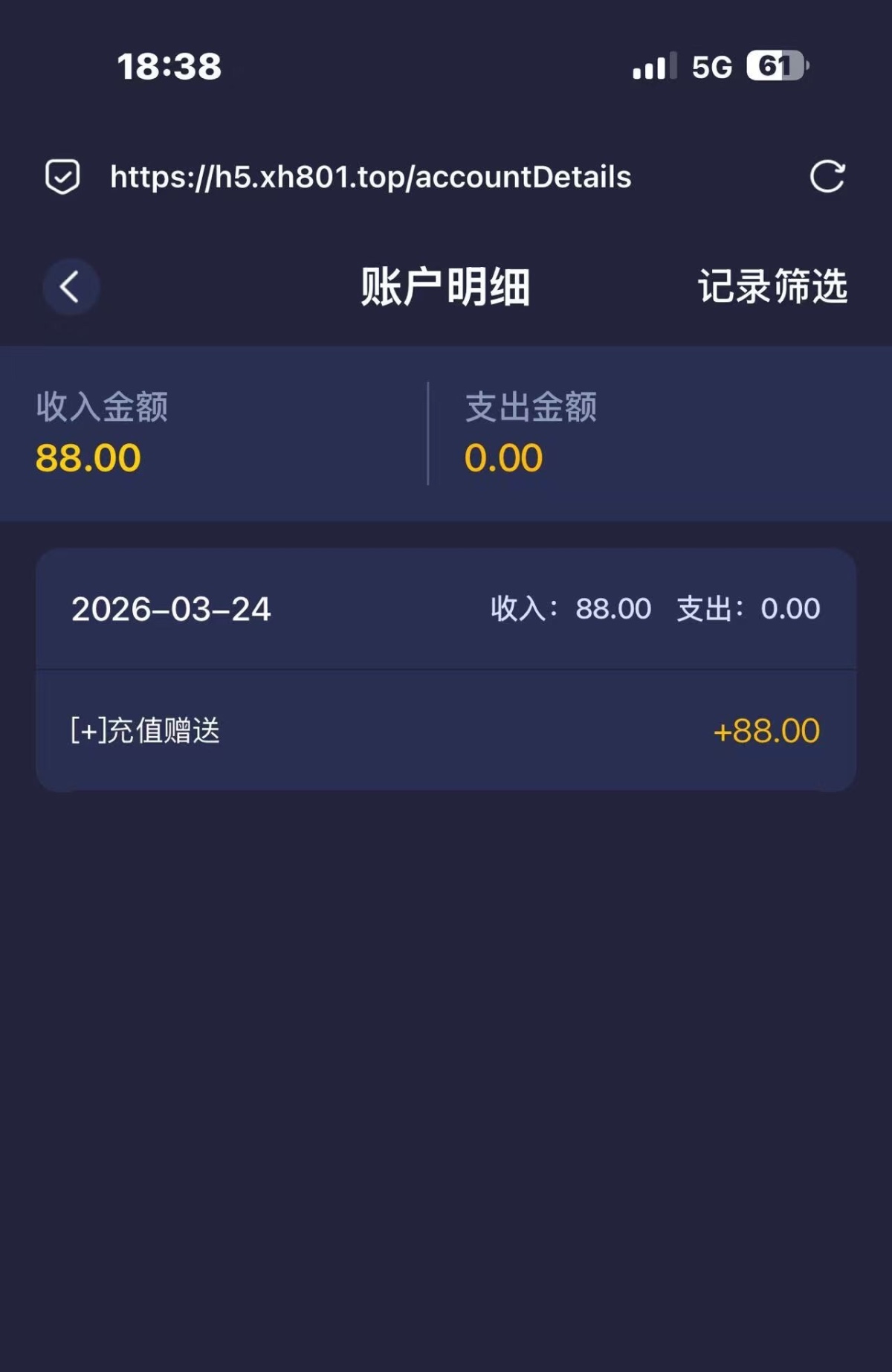 链接xh12.vip 自行碰瓷,送了88没打出,翻了翻贴看到这个半黑,勿充值